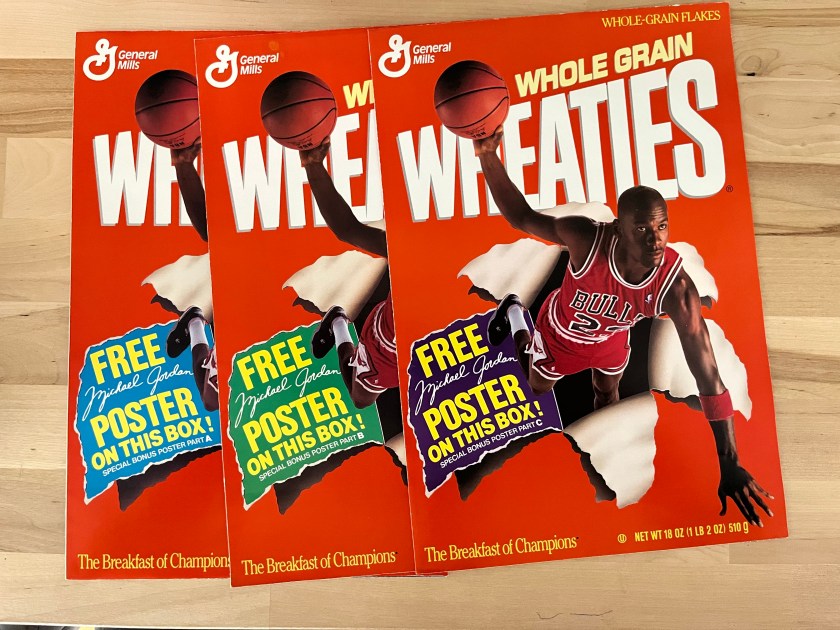 I spent the last week or so rewatching the Last Dance, the ultimate documentary chronicling the history of Michael Jordan’s Bulls. It’s easily the greatest piece of basketball nostalgia for my generation. So much so that it got me thinking back to my childhood and the Michael Jordan paraphernalia that I owned, but was lost to time. I didn’t have a lot, a few cards, magazines, and collector’s cups. Oddly, the most significant piece of memorabilia that sticks out is a poster that came with a box of Wheaties. It was one of a set of three that made one big poster if you had them all. My mother bought several boxes of Wheaties while these posters were included, but I always kept pulling the same one of Jordan shooting a free throw on one side and his torso on the other side, so I was never able to complete the set. The good news is that I was able to easily track them down on eBay.