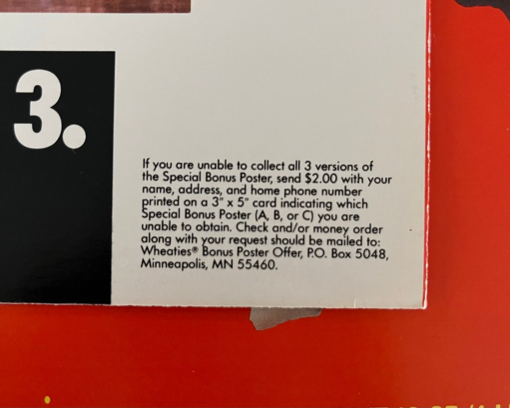 Each poster is marked A, B, or C! And it’s on the outside of the packaging so you KNOW which poster you were getting when you picked up the box! I could have saved weeks, maybe months of disappointment if six-year-old me noticed this detail and could have said “Hey mom! When you go grocery shopping tomorrow, would you get a box of Wheaties that has the Michael Jordan C poster?” Alas, six-year-old me was not astute enough to see this and was left with enough B posters to fill a suitcase.